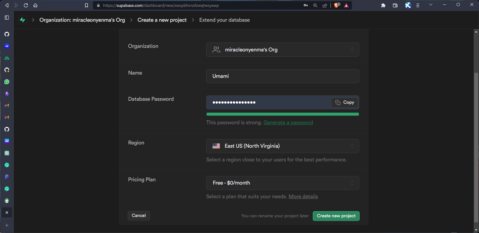 To create the database for Umami, we'll set up a Supabase Postgres database. Sign into your Supabase account, and create a new project in your selected organization. Give it a Name, specify a Database Password, and select a region closest to where you'll be hosting your Umami application.